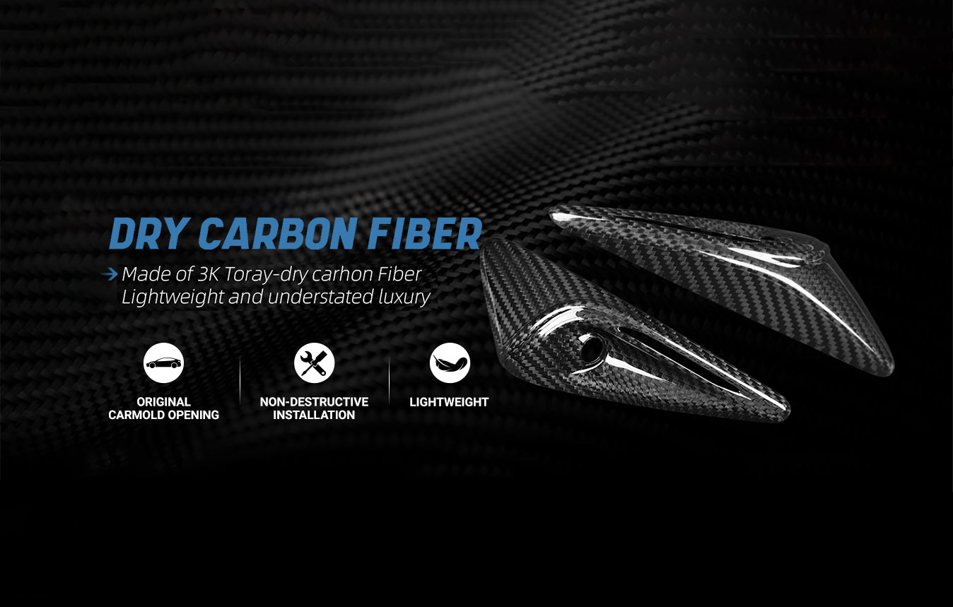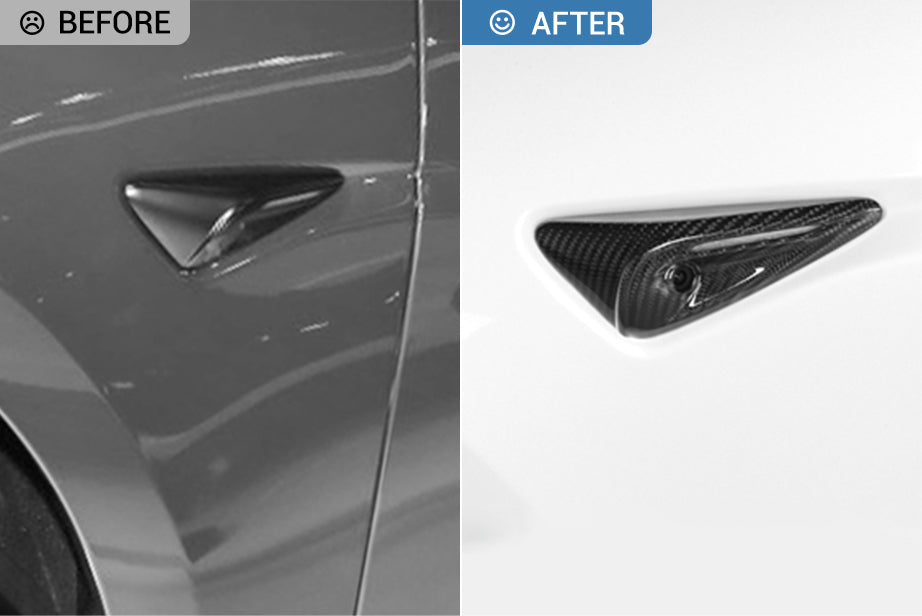 Wie schützt man die Seitenkamera eines Tesla? Die Seitenkamera ist nicht ausreichend geschützt und verkratzt leicht. Montieren Sie diese schönen und praktischen Seitenkameraabdeckungen aus Carbon! Vervollständigen Sie Ihr „Chrome Delete“ stilvoll mit unseren Carbon-Seitenkameraabdeckungen. Hergestellt aus 100 % echter Carbonfaser, schützt sie die Seitenkamera effektiv.