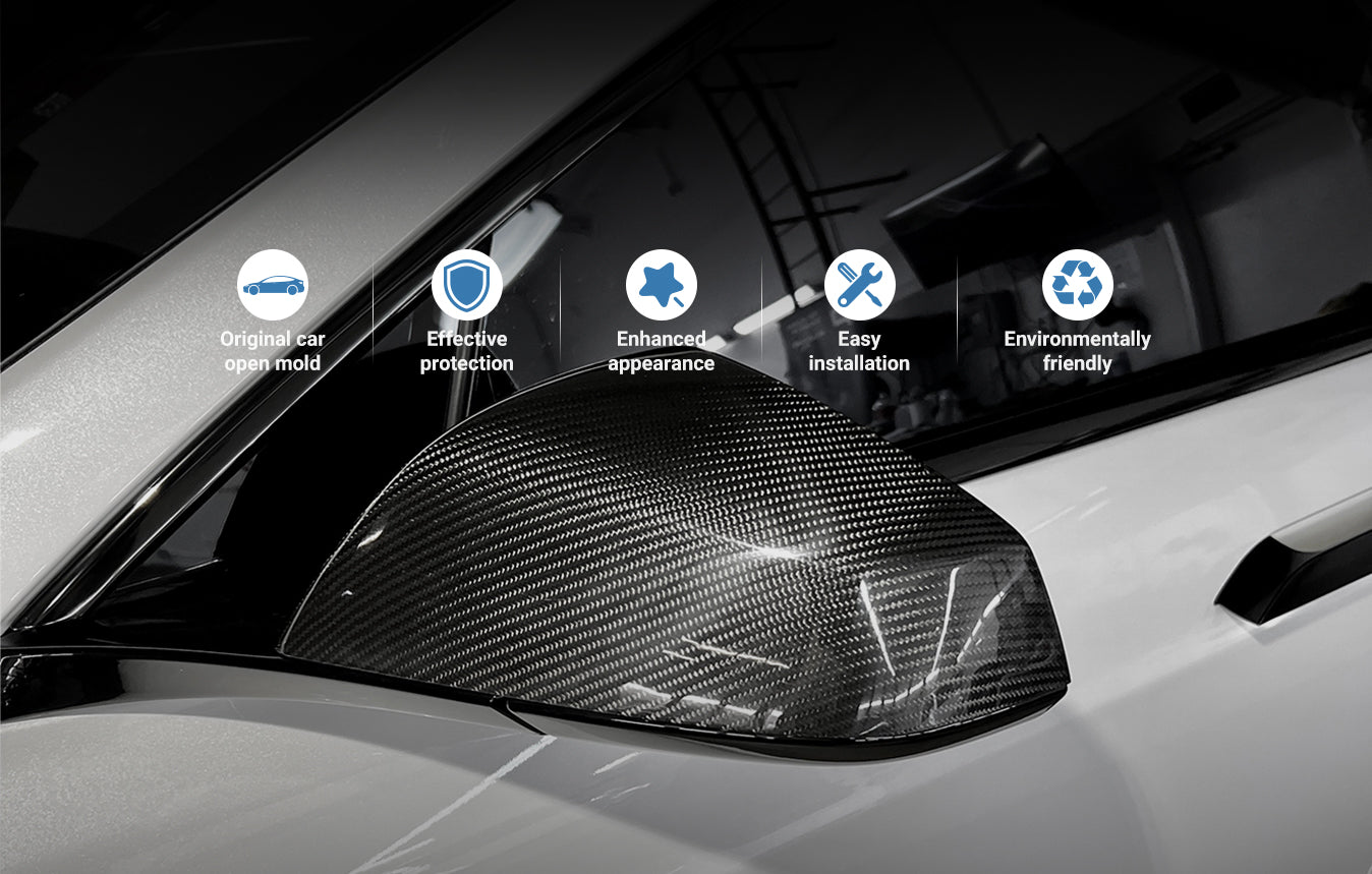Zeigen die Seitenspiegel Ihres Tesla Model X Abnutzungserscheinungen? Unsere Seitenspiegelabdeckungen bieten robusten Schutz vor Kratzern und UV-Schäden, ohne Kompromisse beim Design einzugehen. So bleiben die Spiegel makellos und Ihr Fahrzeug rückt ins beste Licht. Erleben Sie die Verschmelzung von Funktionalität und Ästhetik – schützen Sie Ihre Investition und verbessern Sie Ihr Fahrerlebnis mit unseren hochwertigen Seitenspiegelabdeckungen.