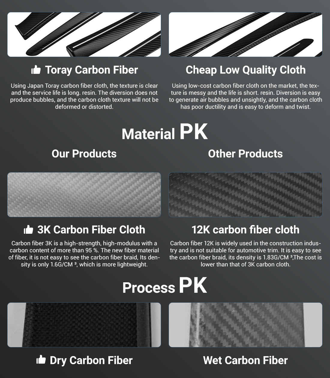 Leicht, langlebig und hochwertig. Im Gegensatz zu Hydro-Dipping- oder Vinyl-Alternativen ist dies authentisches Trockencarbon, das echte Performance-Ästhetik bietet. 3D-gewebte Carbon-Textur, inspiriert von Hochleistungsautos. Langlebig und UV-beständig – Behält seine schöne Optik über lange Zeit, ohne zu vergilben, sich zu verziehen oder abzublättern.